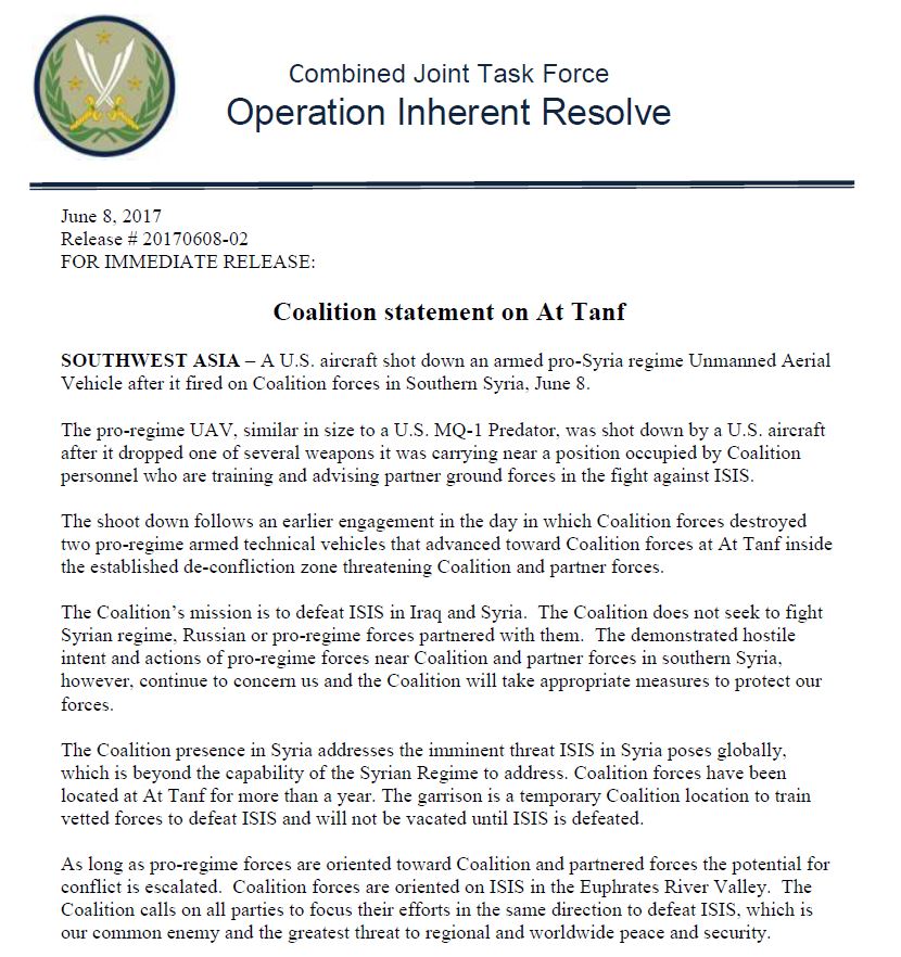 Ud over de ovenstående, har USA også for nylig været i direkte kampe med en af Assad-regimets droner: ”Coaliton statement on At Tanf”, Combined Joint Task Force – Operation Inherent Resolve, 8. juni 2017: https://pbs.twimg.com/media/DB0KeIaWsAEcJuW.jpg:large